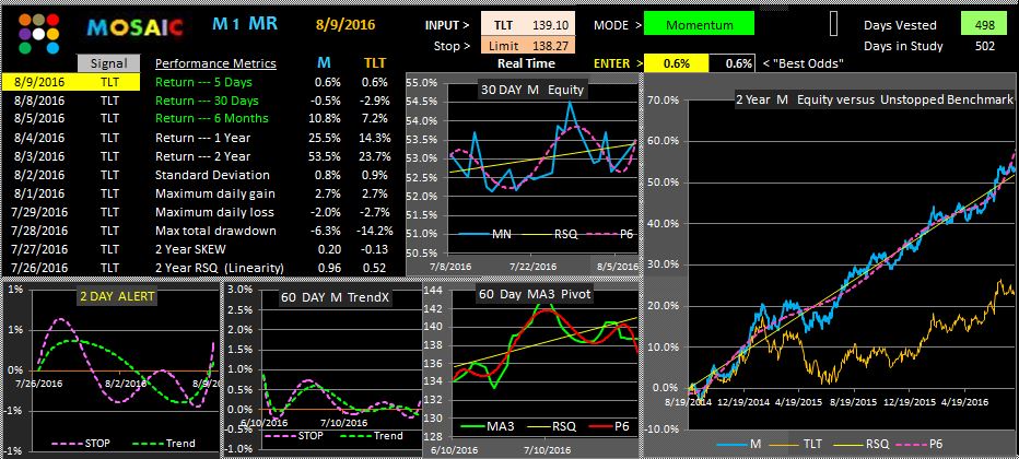 Going forward ...in the next week or so I'm going to create several combo software packages focused on SPY, TLT, QQQ and perhaps XLE. Each one will include the M1 and MVP modules tuned appropriately to that ETF although users can easily change inputs, stop settings and volatility triggers. All programs include real time data that can generate pre-close signals.